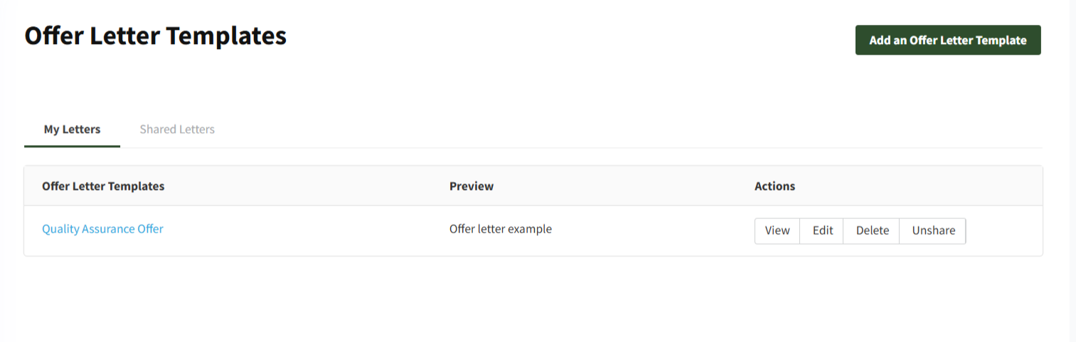 All created and shared templates are listed on the Offer Letter Templates page.