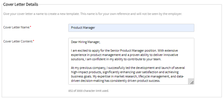 Add the cover letter’s name and content then save the letter.
