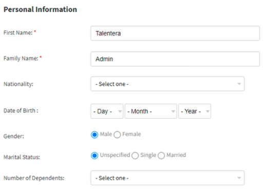- Personal Information section - It contains the below fields: