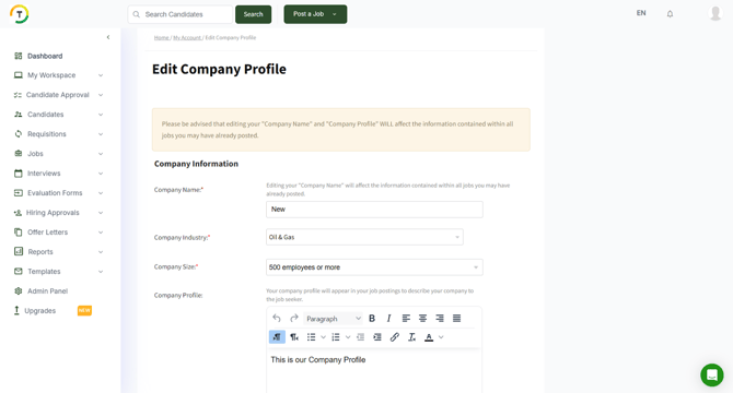 - Company Logo - It’s a symbol of your company's identity. Uploading the logo will help in forming the applicants’ first impression of the company.