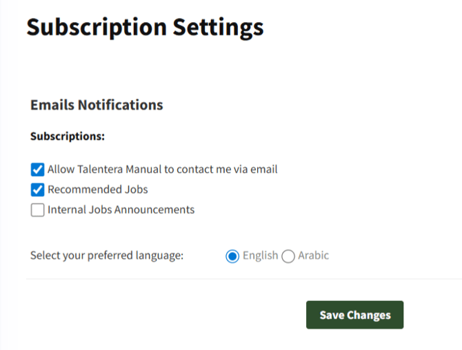 - Emails, Notifications, and Newsletter Subscriptions - You can choose to subscribe to company employer newsletters in English, French. or Arabic based on the enabled languages on the career portal.