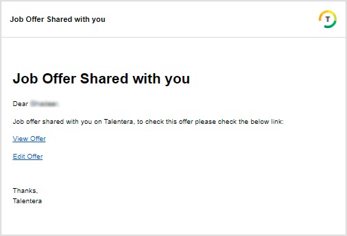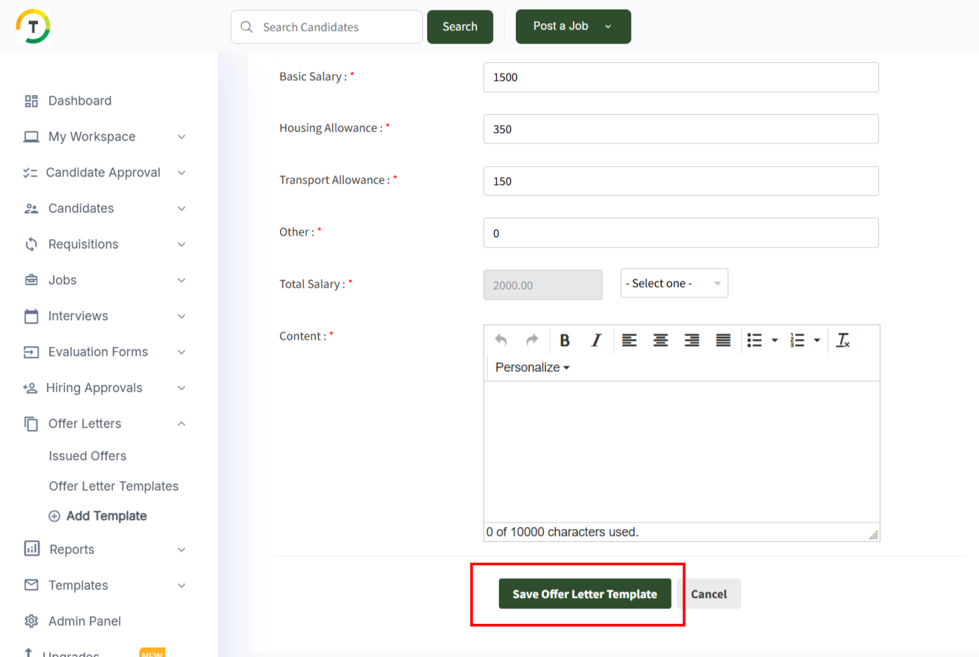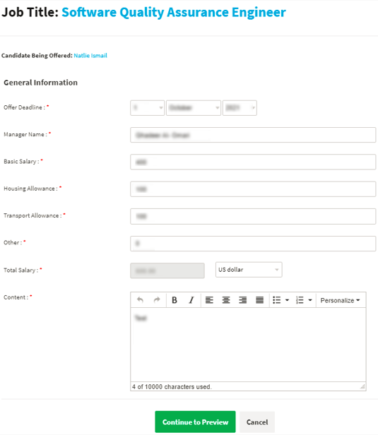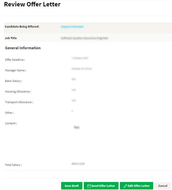 In order to proceed with the hiring process, and after approving the candidate, the HR manager or the hiring manager will send an offer letter to the candidate by clicking on the Send Offer Letter button on the CV view.