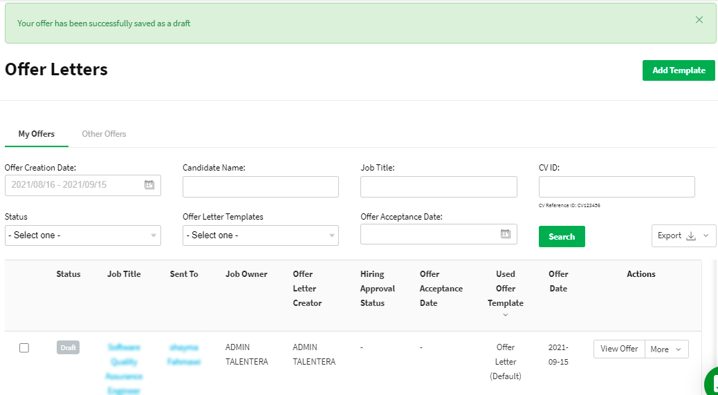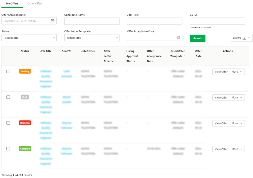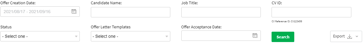 You can search the results by Offer Creation Date, Candidate Name, Job Title, CV ID, Status, Offer Letter Templates, and Offer Acceptance Date.