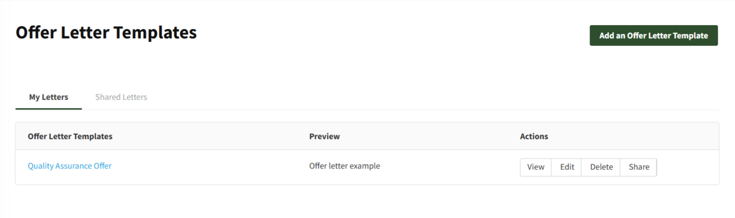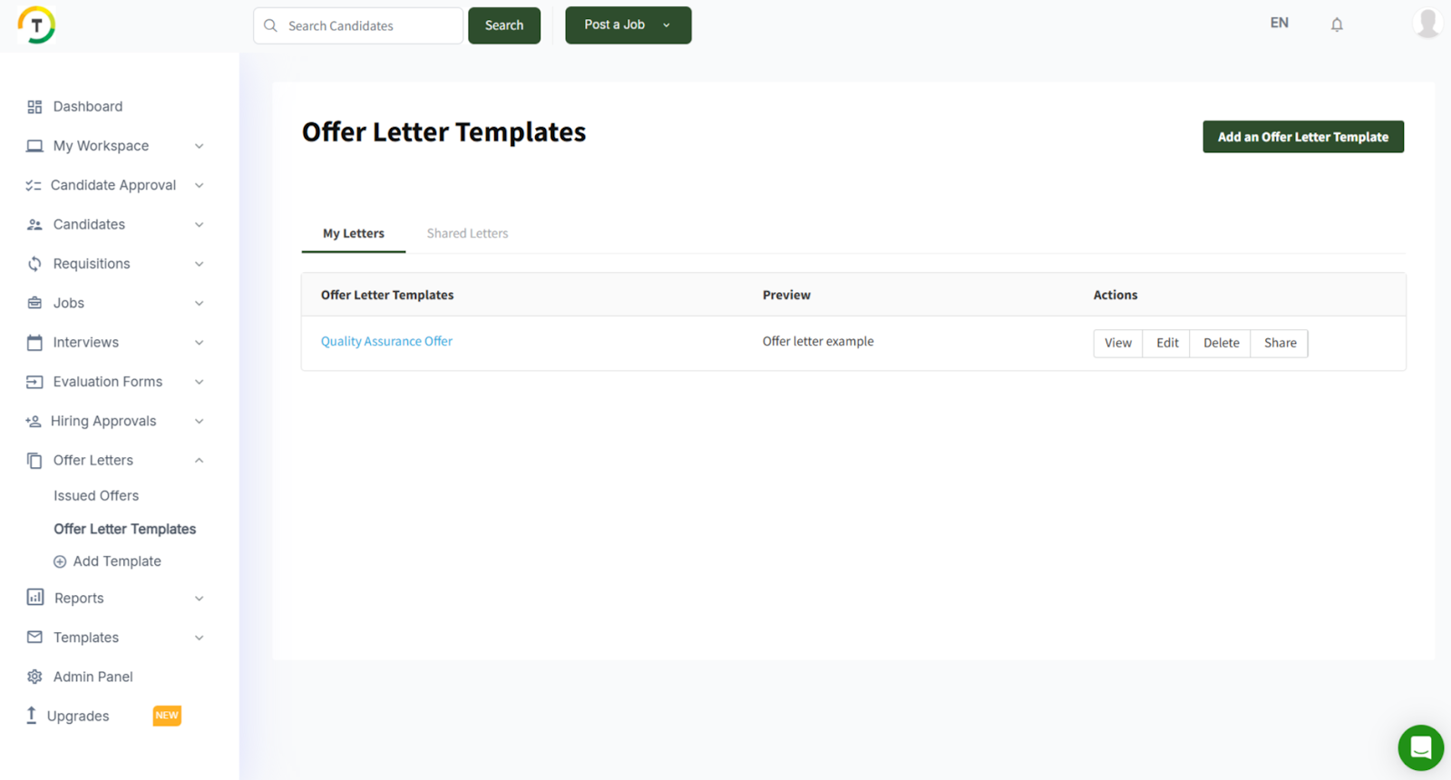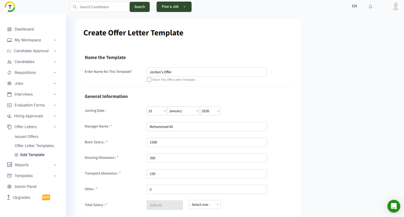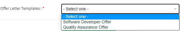 The created templates will appear when creating an offer letter, and the user can select the desired template.
