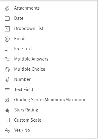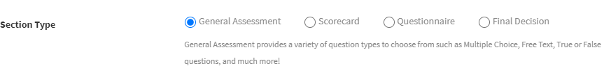 General Assessment- It provides various question types to choose from, such as Multiple Choice, Free Text, Yes/ No questions, and much more!