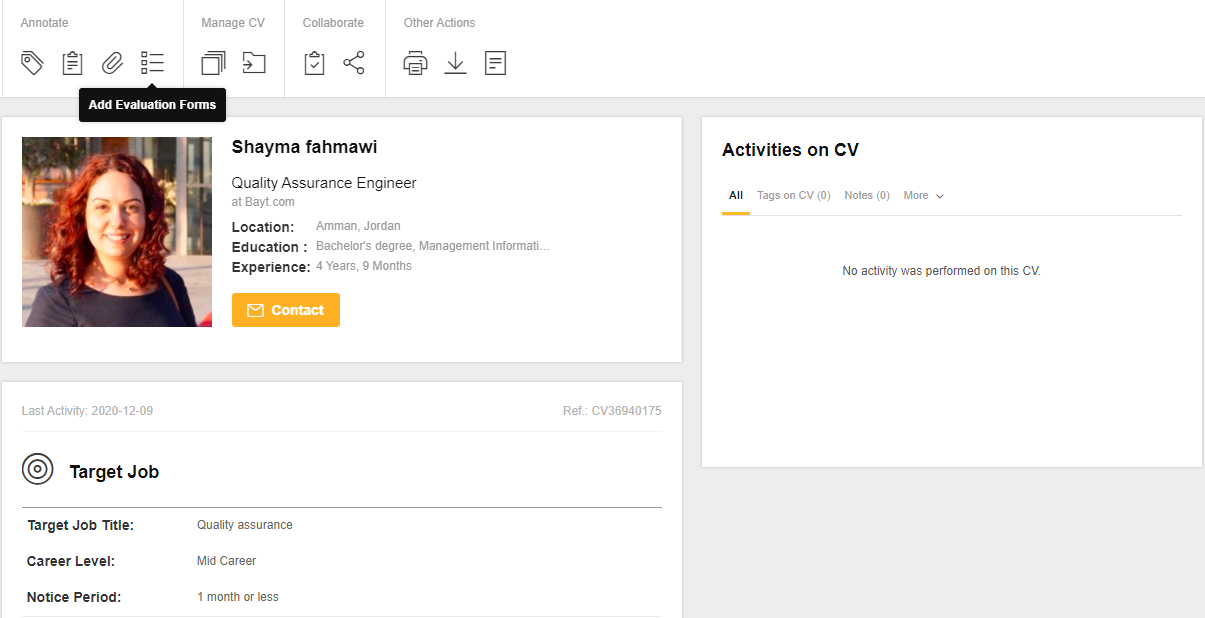 The filled evaluation forms will be added to the Activities on CV- Evaluation forms tab.