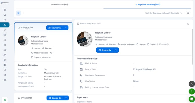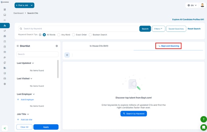 - Start searching for a position within your in-house candidate pool or the Bayt CV Search tab inside Talentera.