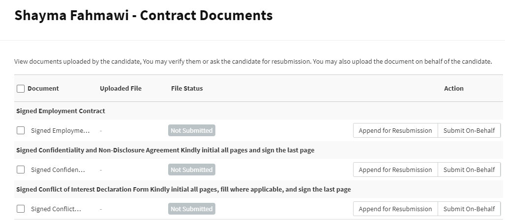When you click on the “View” button, you will be redirected to the document verification page, where you can view the uploaded documents, append for resubmission, and submit the document on behalf of the candidate.