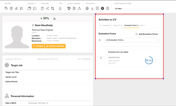 All filled evaluation forms will appear on the candidate page on a section called “Activities on CV” as shown below: