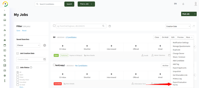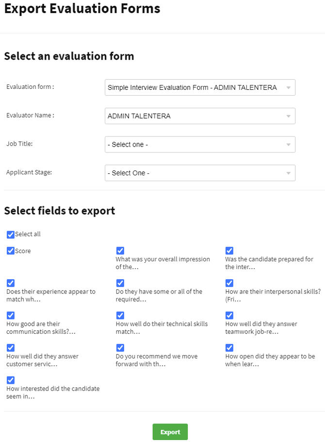 The selected evaluation form can be exported for a specific job or all jobs, for a specific stage or all application stages. Furthermore, the employer can specify the columns available in the selected evaluation form that they want to export and it will be downloaded in Excel format.