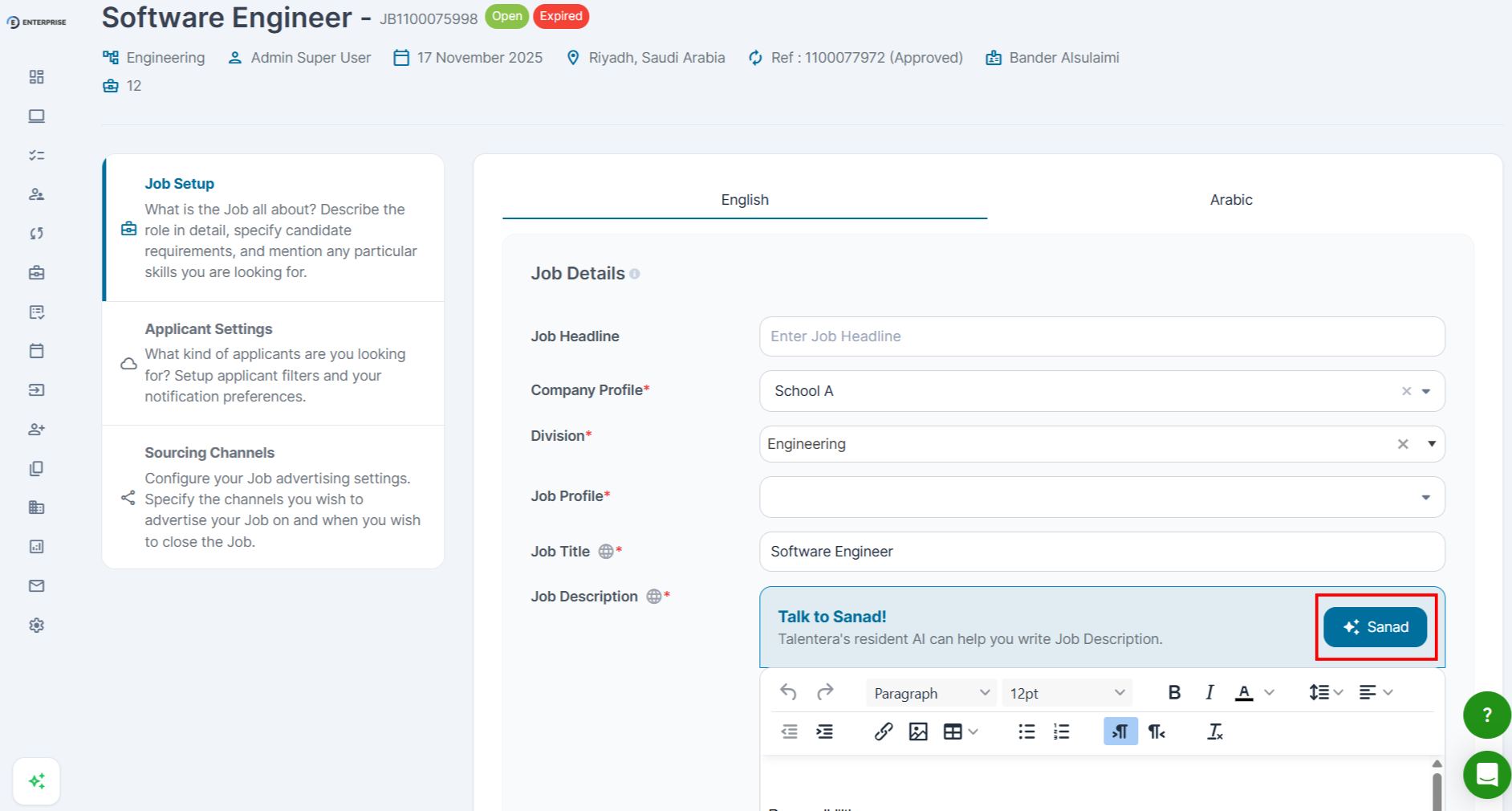 The JD Generator is an AI-powered tool in Talentera that generates a complete, structured job description from a short prompt. Use it when posting a new job, when an existing JD is incomplete, or before enabling SANAD Sourcing or Shortlisting.