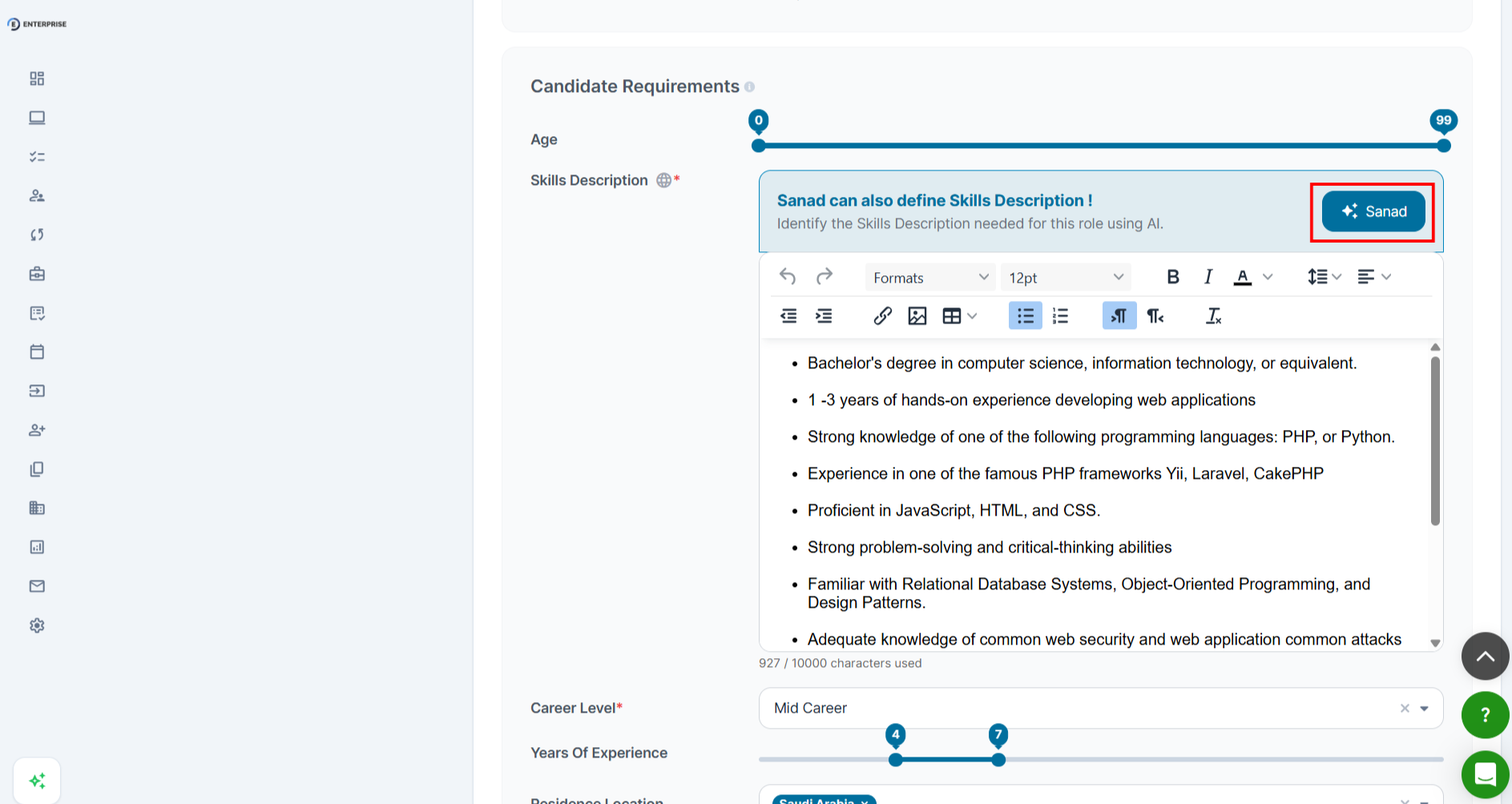 The Skill Generator is an AI-powered tool that automatically generates a relevant skills list for a job based on its title and description. A complete, accurate skills list improves the quality of results from SANAD Sourcing and SANAD Shortlisting.