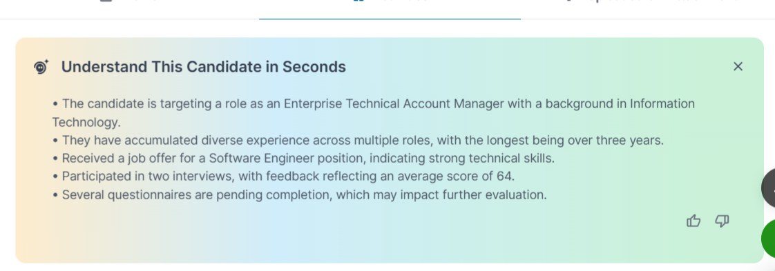If a candidate has limited activity in your account, the summary will be short. This is not an error. In these cases, rely on the candidate’s CV and your direct evaluation.