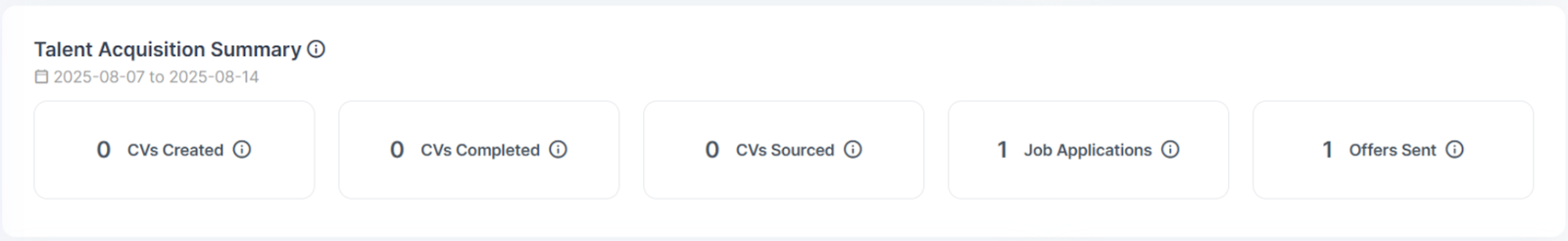 The Talent Acquisition Summary widget provides a comprehensive overview of your recruitment efficiency within the selected time period. It displays key metrics such as the number of CVs created, completed, sourced, job applications submitted, and offers sent.