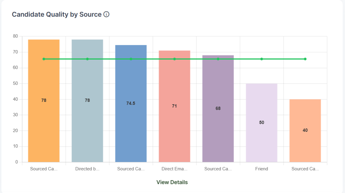 The Candidate Quality by Source widget measures the quality of candidates by calculating the average evaluation form score for all CVs coming from the same CV source. This allows you to assess which sources are providing the highest-quality candidates and make more informed decisions on where to focus your sourcing efforts.