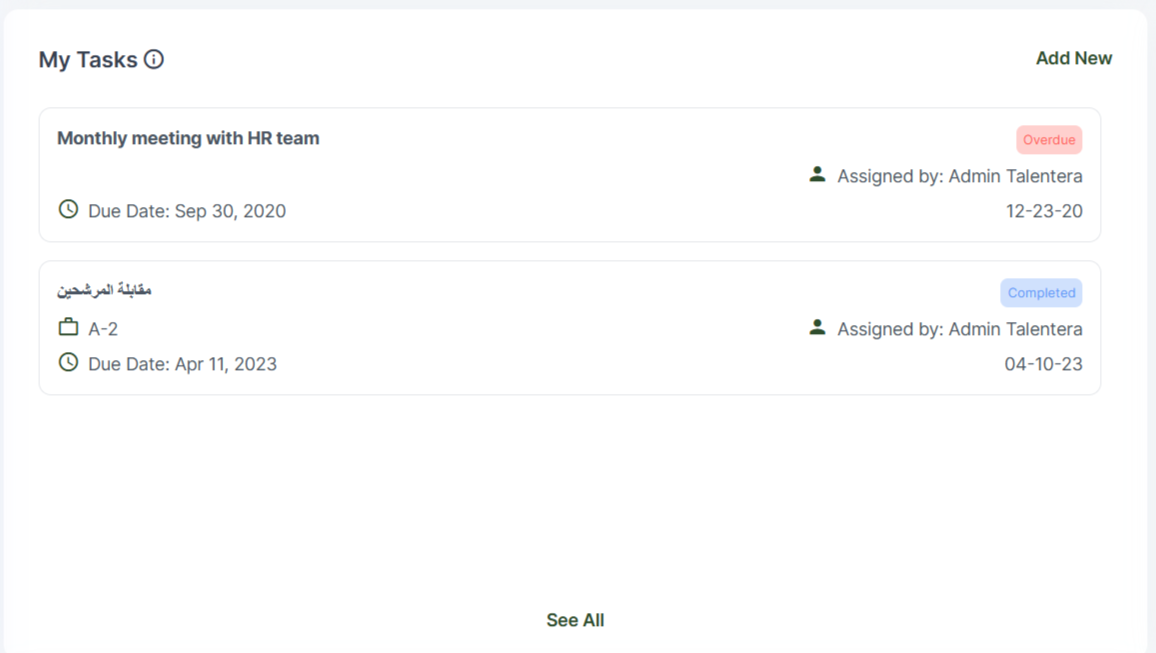 The My Tasks widget shows all tasks assigned to you in one place. You can easily open the linked Job, CV, or Requisition to take action quickly.