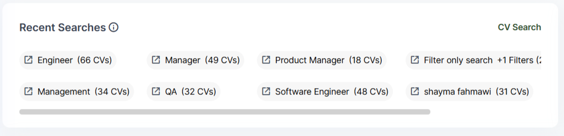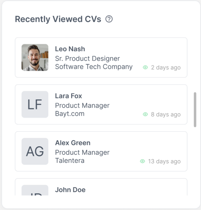 The Recently Viewed CVs widget displays the last 10 CVs you accessed within the selected time range. The list is ordered by most recently viewed first, allowing you to quickly revisit candidate profiles without repeating searches.