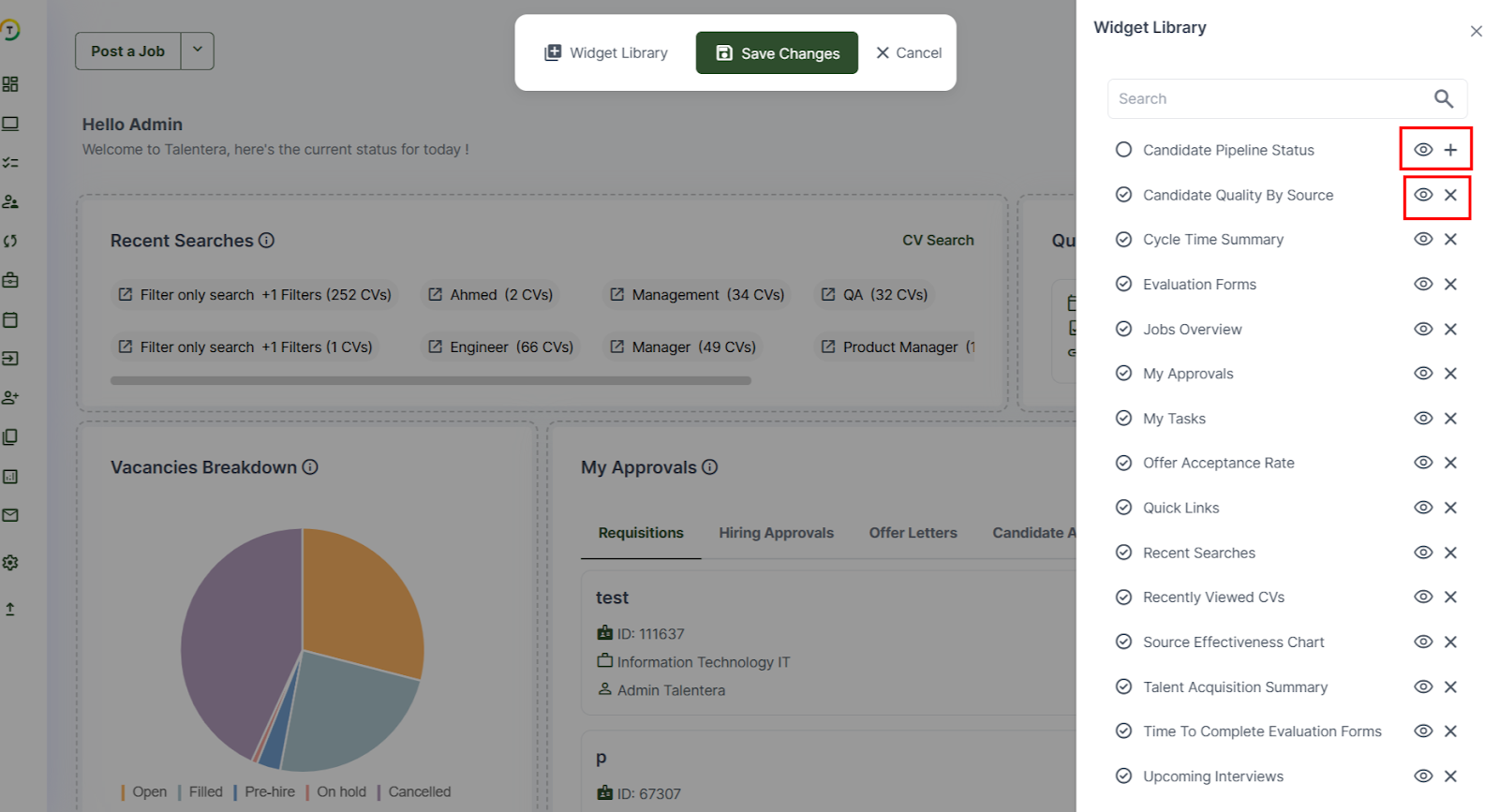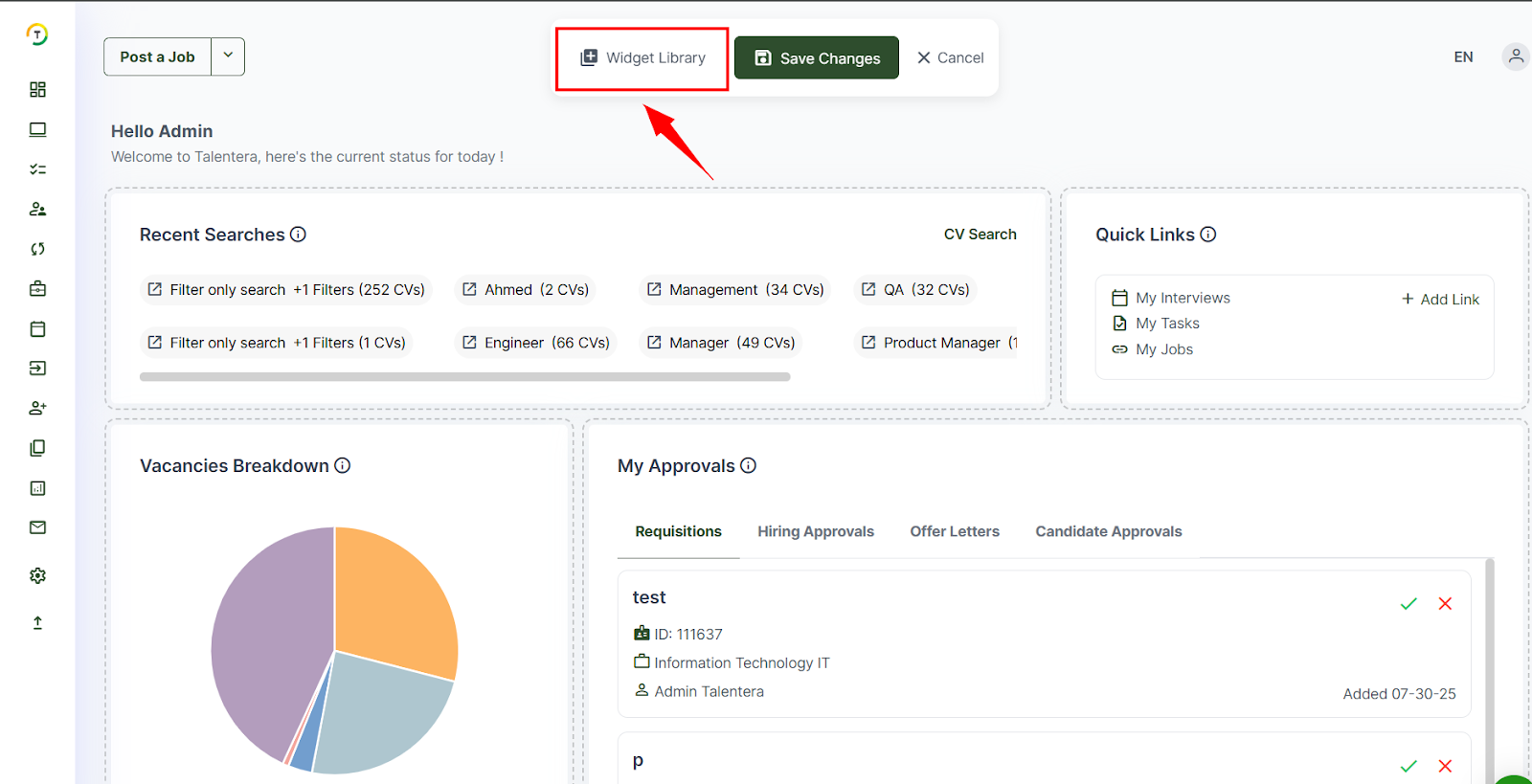 The Dashboard section in Talentera provides an at-a-glance overview of key statistics and insights through customized widgets, offering flexibility to tailor the layout according to your preferences. You can arrange and personalize widgets such as Talent Acquisition Summary, My Approvals, Vacancies Breakdown, Jobs Overview, My Tasks, Upcoming Interviews, and many more. This customization enables users to focus on the most relevant data, streamline their daily workflow, and monitor activities across the platform efficiently.