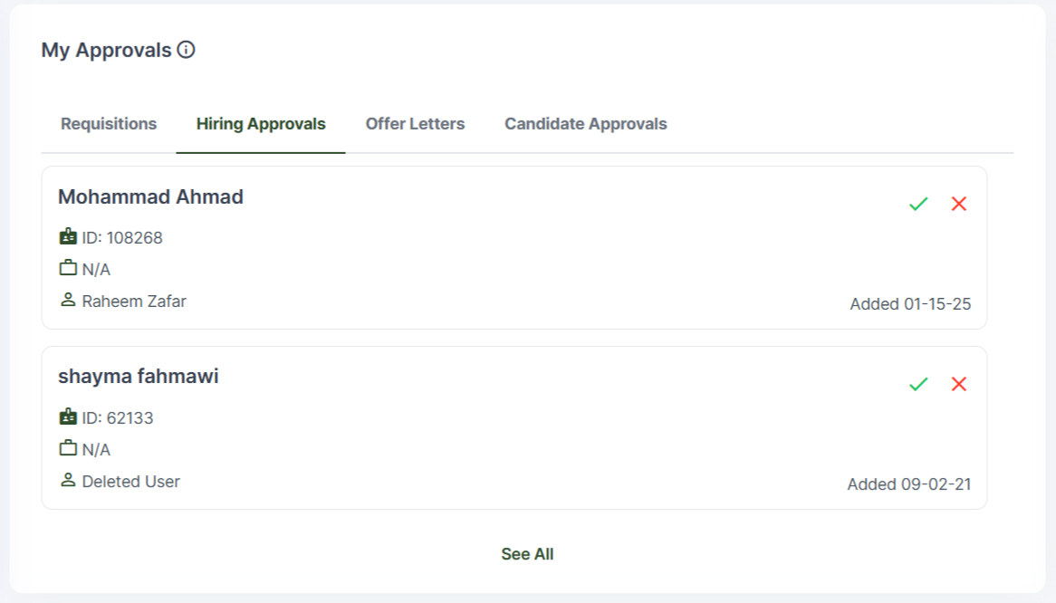 The My Approvals widget consolidates all your pending approval requests into one convenient location. From here, you can review, approve, or reject requests with a single click, streamlining decision-making and ensuring a faster turnaround time.