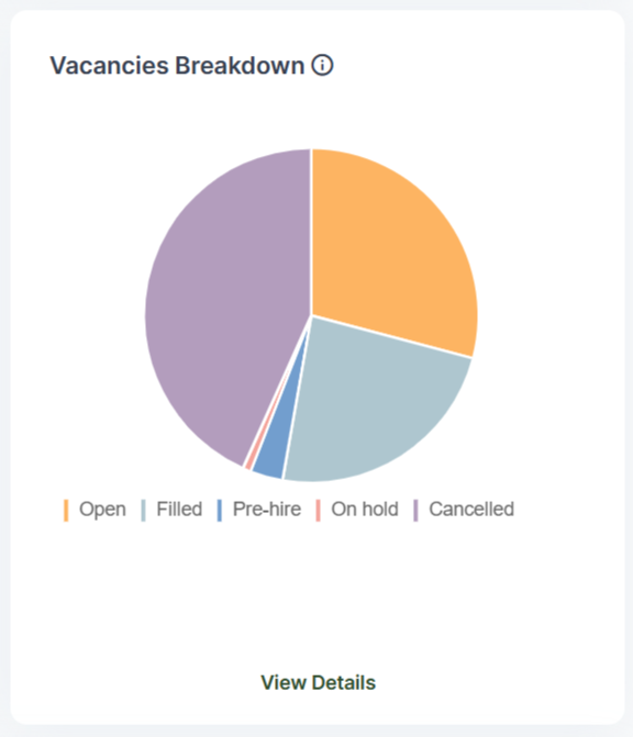 The Vacancies Breakdown widget provides a clear status summary for each vacancy within a job post. It categorizes vacancies as Filled, Open, or Pre-hired, On hold, Cancelled, Draft allowing you to quickly assess recruitment progress and identify positions that require immediate attention. You can also hover over each status to view more details about it, giving you a quick and interactive way to understand its meaning.