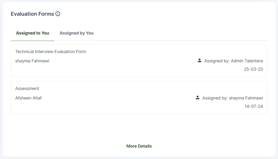 The Evaluation Forms widget allows you to view all evaluation forms that are assigned to you as well as those you have assigned to other users on the career portal. From the dashboard, you can easily track the status and progress of these forms, ensuring evaluations are completed on time and keeping the process organized.