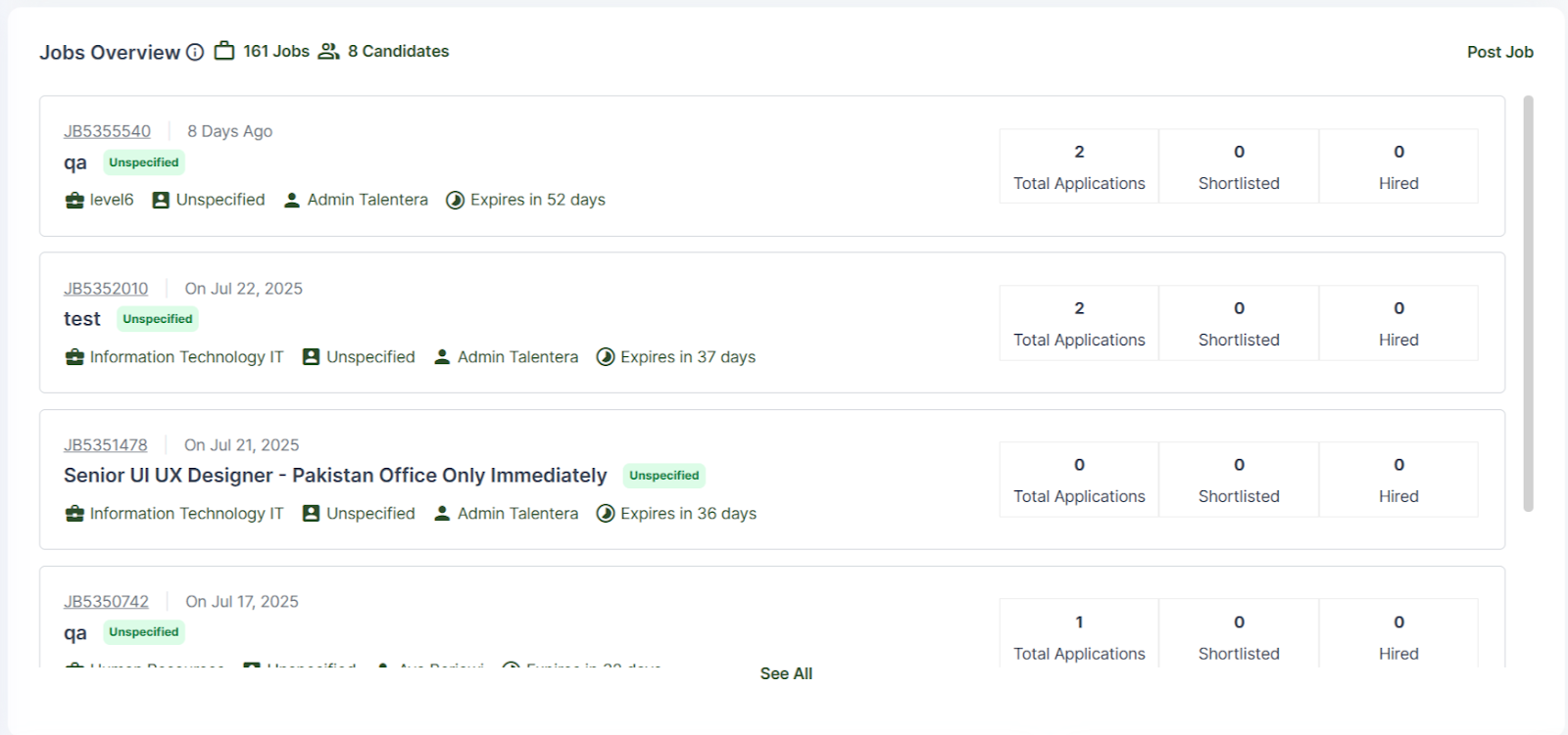 The Jobs Overview widget provides a quick snapshot of your latest open jobs, whether they were created by you or shared with you. This at-a-glance view helps you stay updated on active vacancies, track job statuses, and prioritize your recruitment activities without navigating through multiple sections.