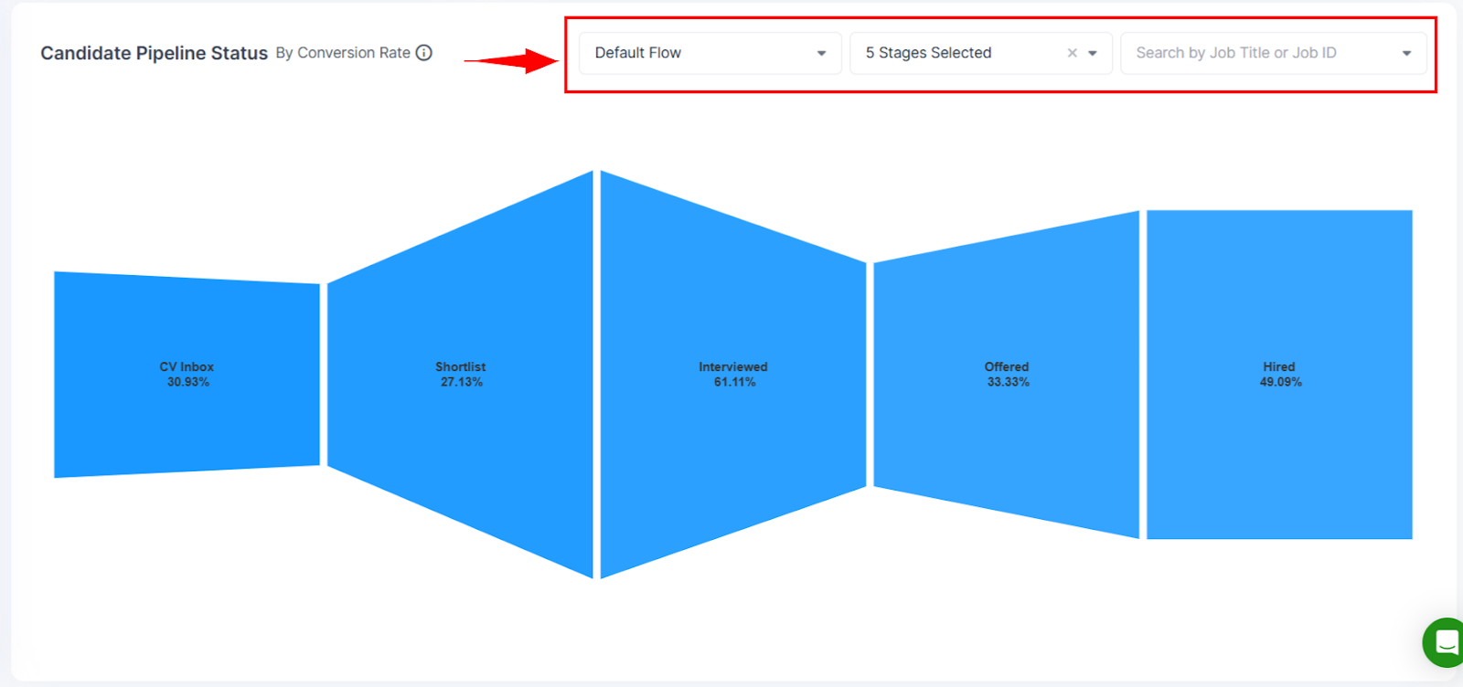 The Candidate Pipeline Status widget tracks how effectively candidates are progressing through the recruitment stages. It allows you to filter the graph by candidate selection flow, specific stages, and Job title/ID, giving you a clear view of where candidates stand, identifying any bottlenecks in the hiring process, and reflecting how effectively candidates are progressing to future stages, represented as a percentage.