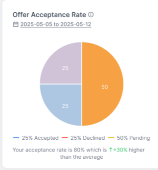 The Offer Acceptance Rate widget shows the percentage of job offers that have been accepted, declined, or are still pending. It provides insights at the organization level while also allowing you to compare your own acceptance rate against the company’s overall average.