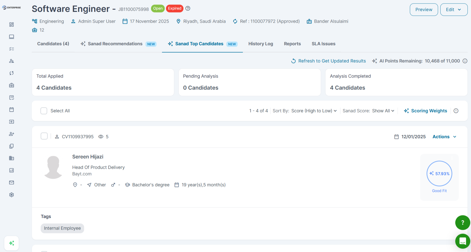 When SANAD Shortlisting is enabled on a job, the AI analyzes each applicant’s submitted CV against the job description. Applicants are scored and ranked by match strength.